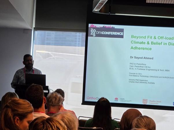 At the heart of our presence was our Founder, Dr Sayed Ahmed’s Rapid Fire session presentation, “Beyond Fit and Offloading: Culture, Climate & Belief in Diabetic Footwear Adherence.” Dr Ahmed began with a clear truth: “Adherence is low, especially in indoor settings.” Our clinic monitoring and research echo this, showing a big difference in the use of diabetic footwear internally as opposed to externally. Acknowledging his PhD supervisors, Professor Susan Nancarrow and Dr Alex Barwick, and his mentor in pedorthics, Mr Karl-Heinz Schott, Sayed always goes to great lengths to pay tribute to those who played such vital roles in his journey to becoming Australia’s first PhD in Pedorthics.